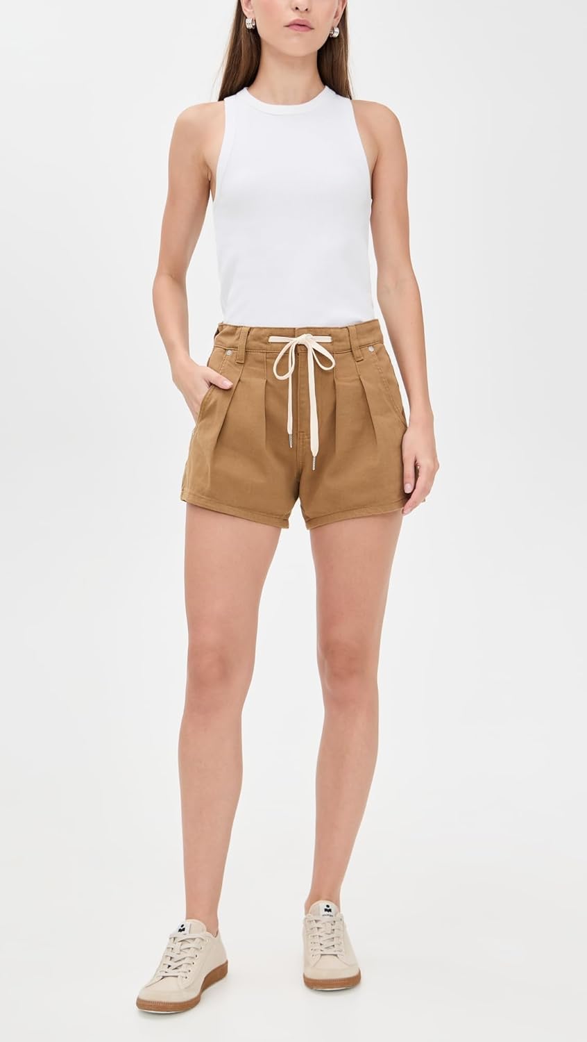 These shorts feature a relaxed mid-rise cut with pleated details. The clever combination of cotton denim, front pleats, and a drawstring waist creates a balanced look that strikes a balance between casual and sophisticated. Pair them with a simple T-shirt for a casual look or a more formal top for a more elevated look.