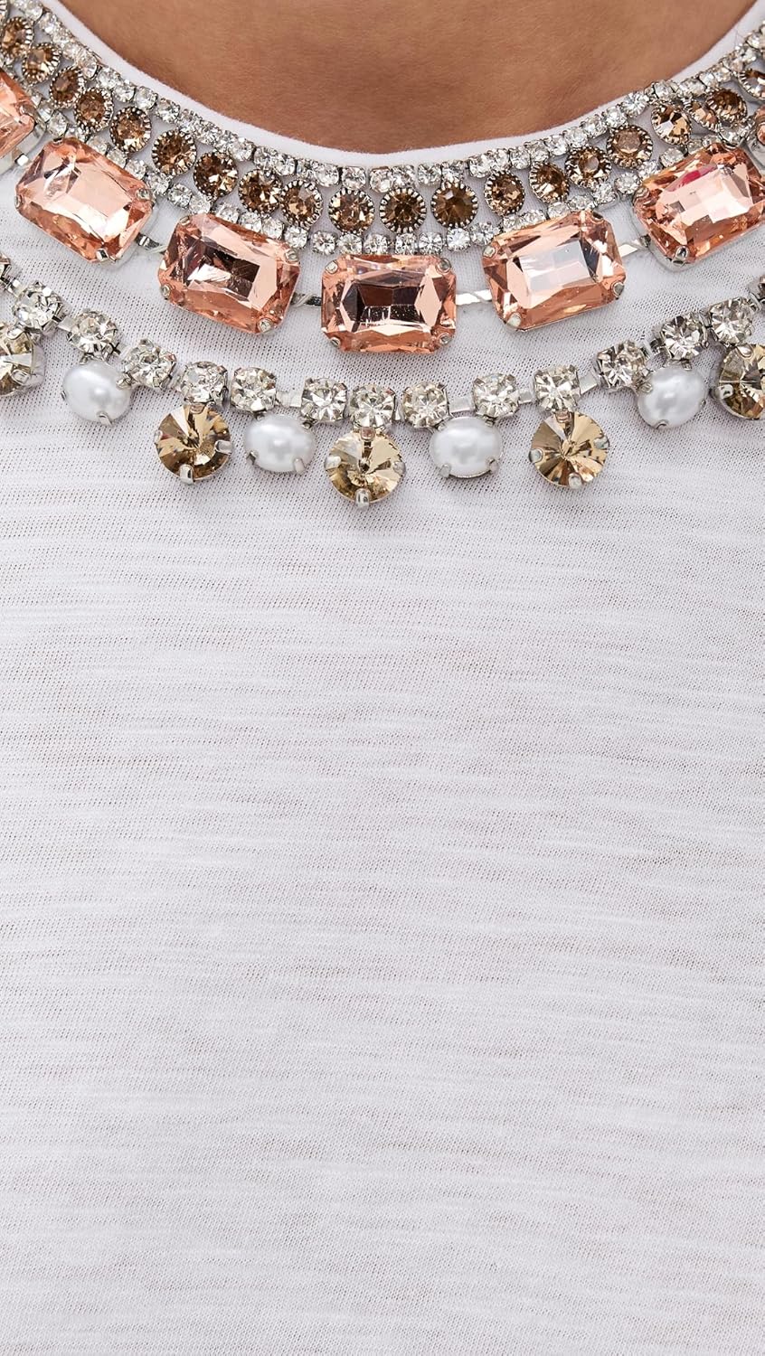 This T-shirt features a relaxed, relaxed fit. The simple silhouette and striking neckline embellishment create a balance between casual comfort and sophisticated style. It easily pairs well with jeans, skirts, or shorts for a variety of looks.