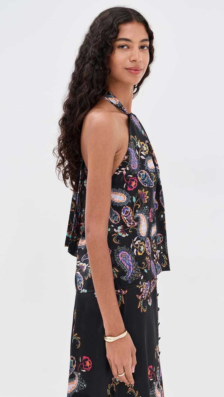 Dry clean only. To preserve the delicate texture of the silk, the vibrant paisley print, and the top’s shape, professional dry cleaning is recommended. Avoid machine washing or home washing methods that may damage the silk.